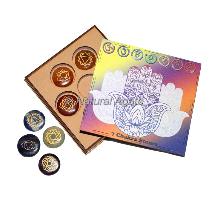 An excellent range of 7 Chakra Set with Hamsa Design Wood Gift Box. The Hamsa Hand is an ancient Middle Eastern amulet symbolizing the Hand of God. In all faiths it is a protective sign. It brings its owner happiness, luck, health, and good fortune. Holding crystals or placing them on your body is thought to promote physical, emotional and spiritual healing. Crystals supposedly do this by positively interacting with your body`s energy field, or chakra. While some crystals are said to alleviate stress, others purportedly improve concentration or creativity.