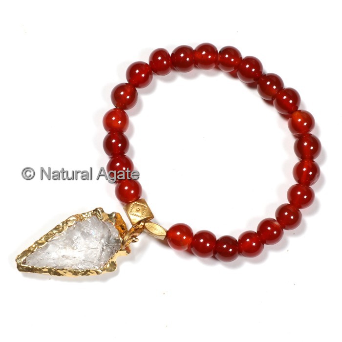Purchase AAA Red Carnelian With Arrowheads Bracelets today from Natural Agate. The arrowhead was worn around the neck to ward off the Evil Eye. It symbolized courage, strength, and protection. Native Americans believed the arrowhead could deflect negative energy and allow the wearer to absorb their enemy`s power. Natural Agate offers the best deal on AAA Red Carnelian With Arrowheads Bracelets online. Some arrowheads have been made from wonderful stone such as quartz. In ancient Greece the arrowhead was made of bronze and they were often triangular in shape.
